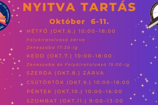 Kedves Olvasóink! Az Országos Könyvtári Napok rendezvényei miatt jövő héten módosul könyvtárunk megszokott nyitvatartása, valamint…