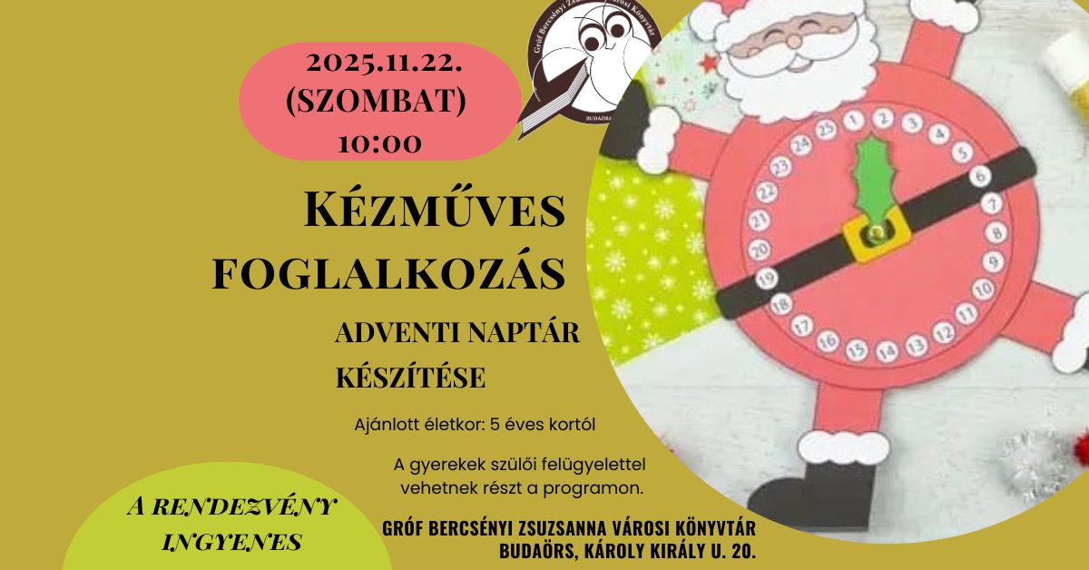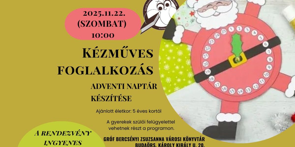 Közeleg az év legmeghittebb időszaka, amikor mindenki izgatottan készül a karácsonyra. A Gróf Bercsényi Zsuzsanna Városi Könyvtár szeretettel várja a családokat egy vidám, közös adventi naptárkészítő foglalkozásra, ahol a gyerekek saját kezűleg alkothatnak egyedi naptárt – papírból, ragasztással, vágással és sok-sok fantáziával.